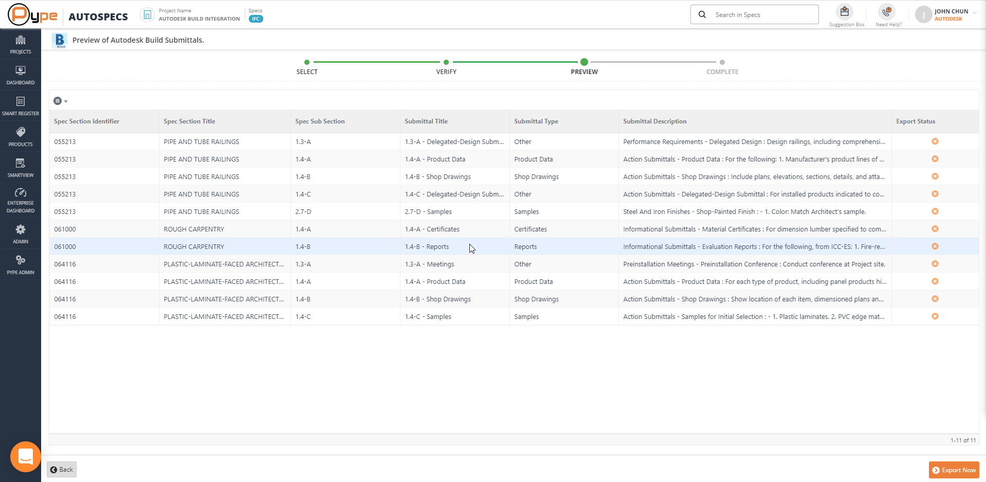 - The submittals that you see on the screen will be exported into Autodesk Build. If you hover over a specific line-item under Export Status, it will show that a new submittal will be created. Click Export Now to finish exporting.