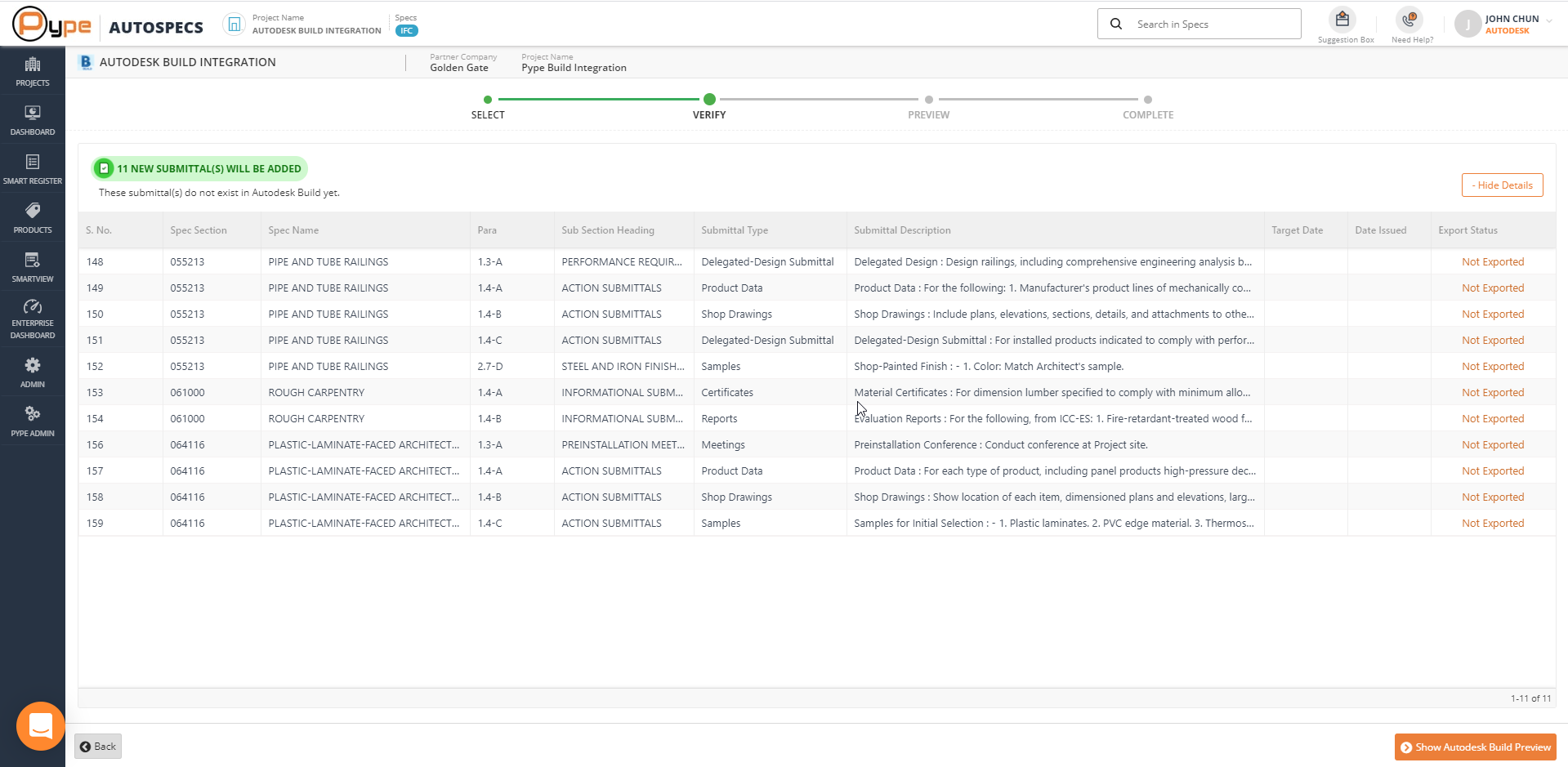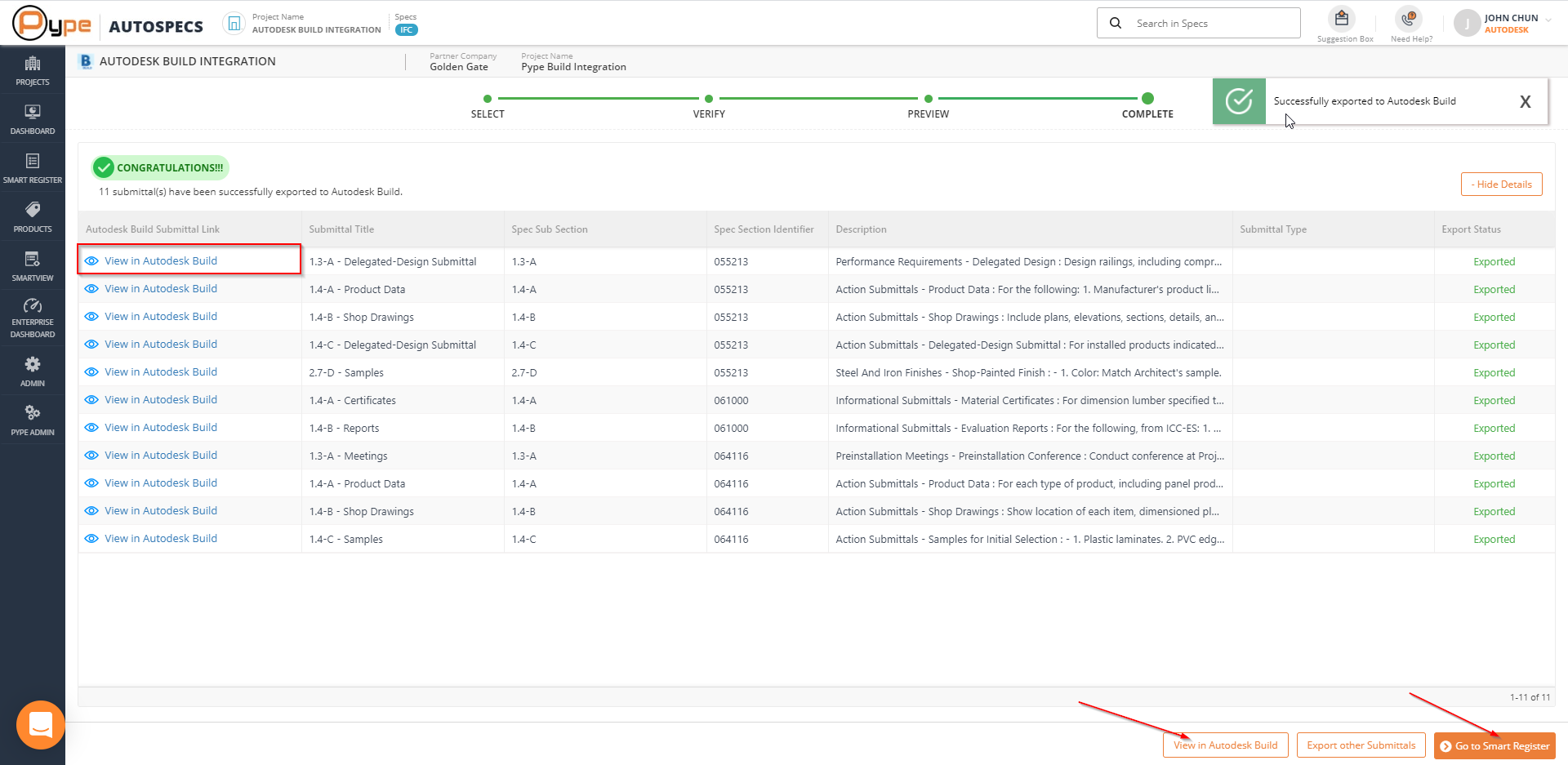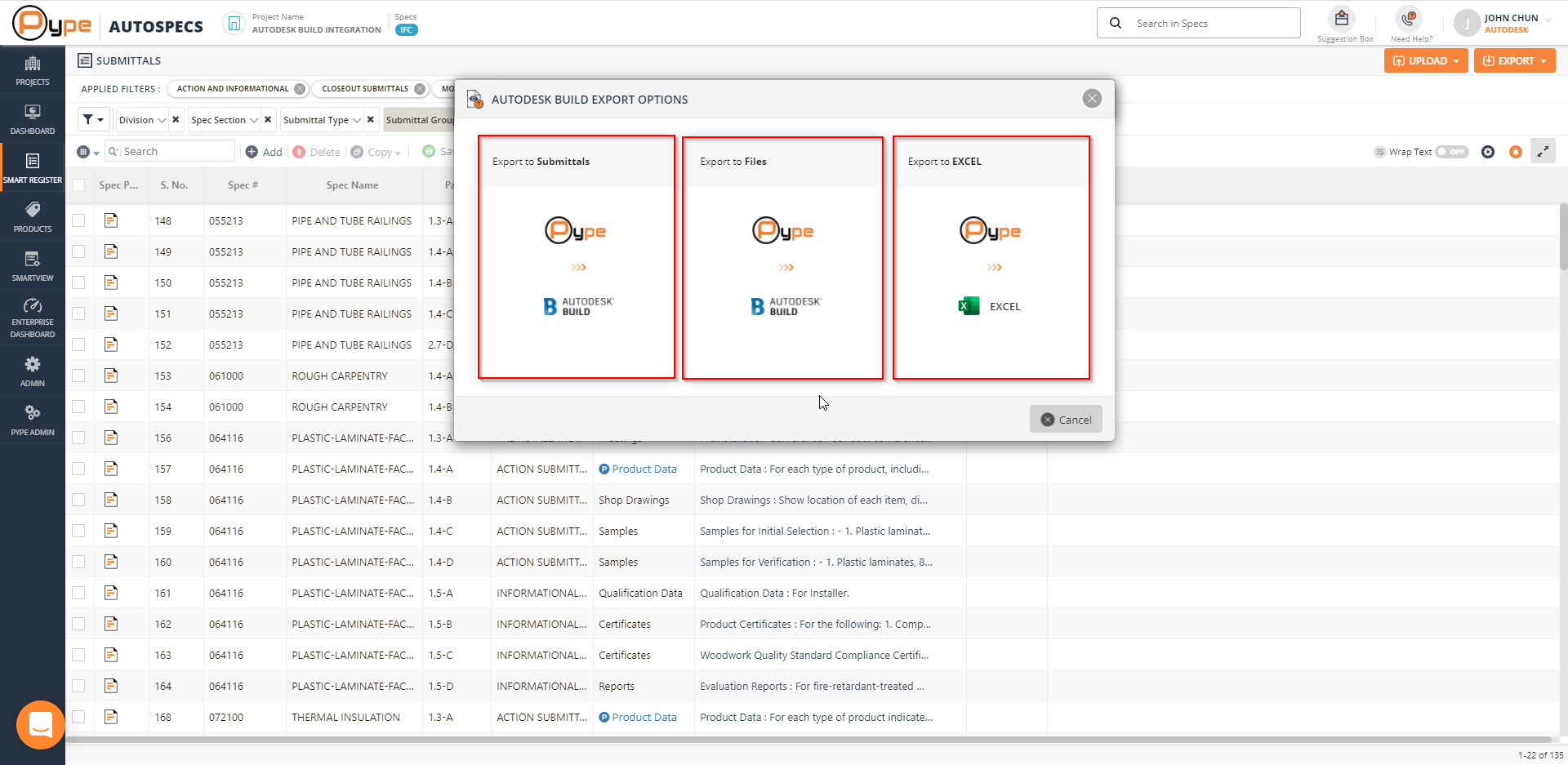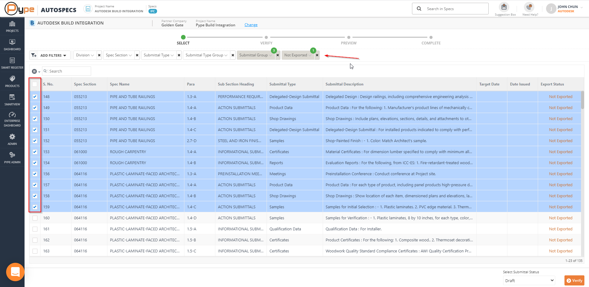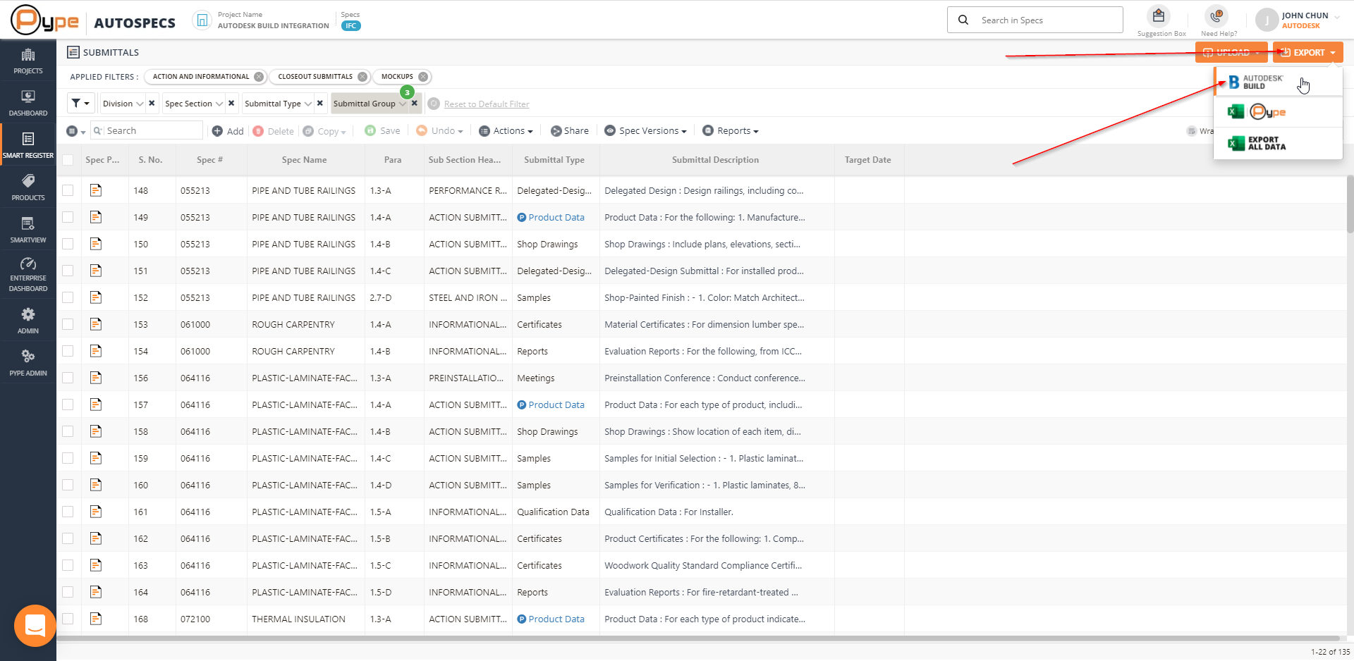 - Select the submittals you would like to export from Pype AutoSpecs to Autodesk Build. You can utilize the filters on top to narrow down your list for export.
