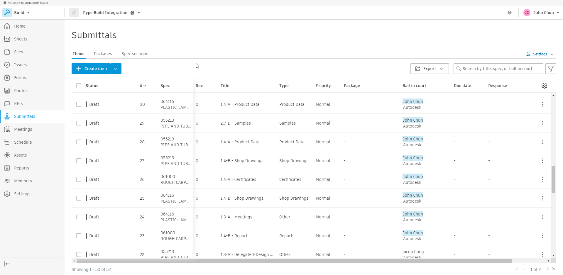- If you click View in Autodesk Build, it will open the Autodesk Build Submittals tool where the submittals have been exported to for submittal management.