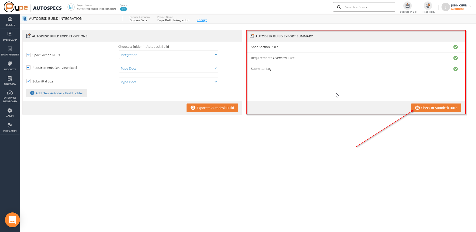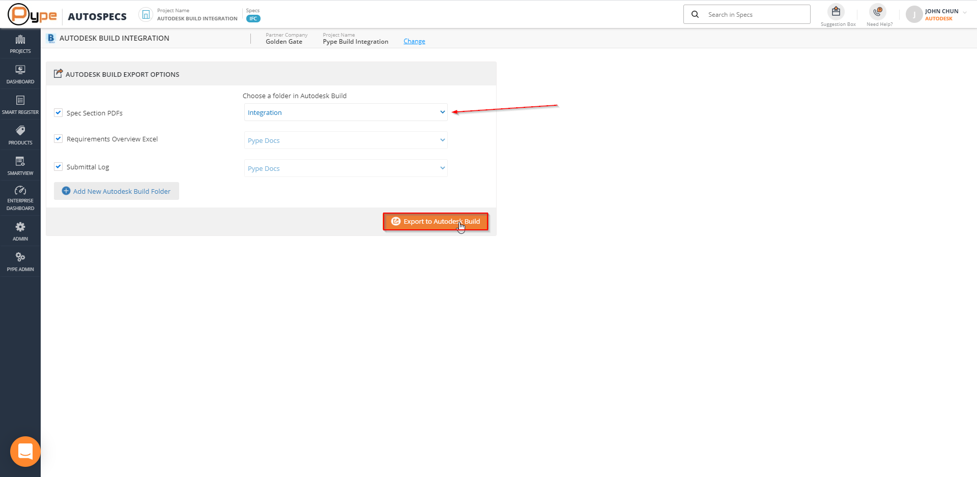- AutoSpecs will give you an option to export Spec Section PDFs, Requirements Overview Excel, and Submittal Log. For Spec Section PDFs, you can create a new folder within the Files tool in Autodesk Build by clicking on Add New Autodesk Build Folder or select a folder available in the drop-down menu. After making your selection, click Export to Autodesk Build. Depending on the number of spec sections found within the project, the time it takes to export will vary. Once the export is complete, you will receive an email confirming it has been completed.