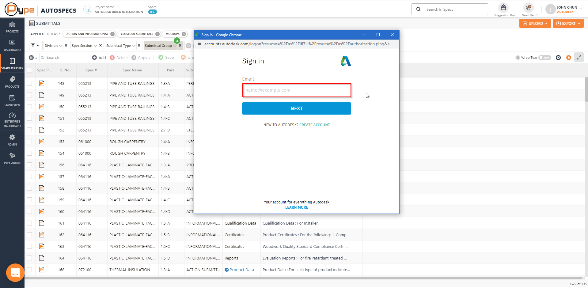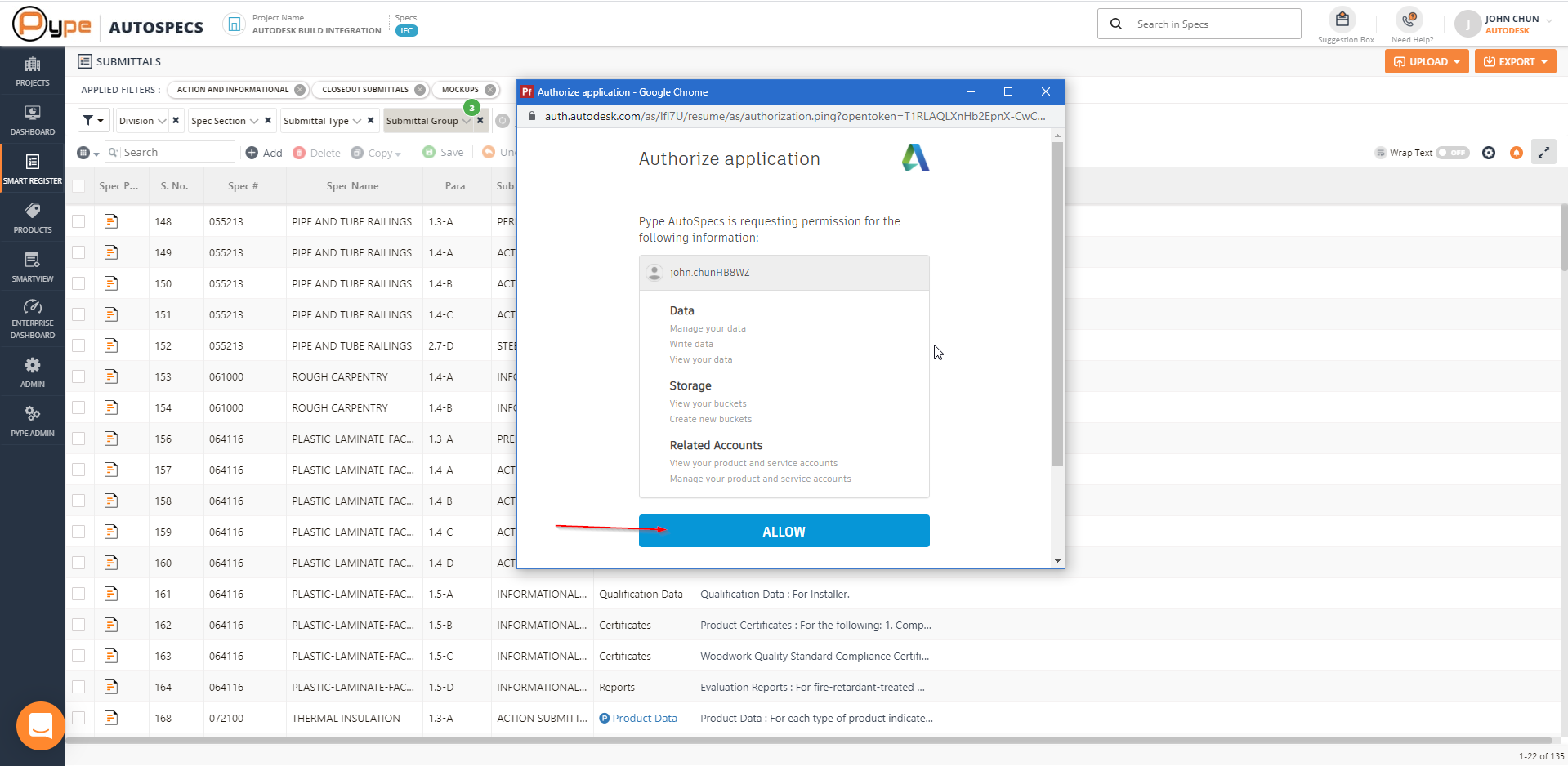 - Select Export to Submittals and sign-in to Autodesk Build using your Autodesk credentials. Then click Allow to authorize AutoSpecs to access your Autodesk Build project.