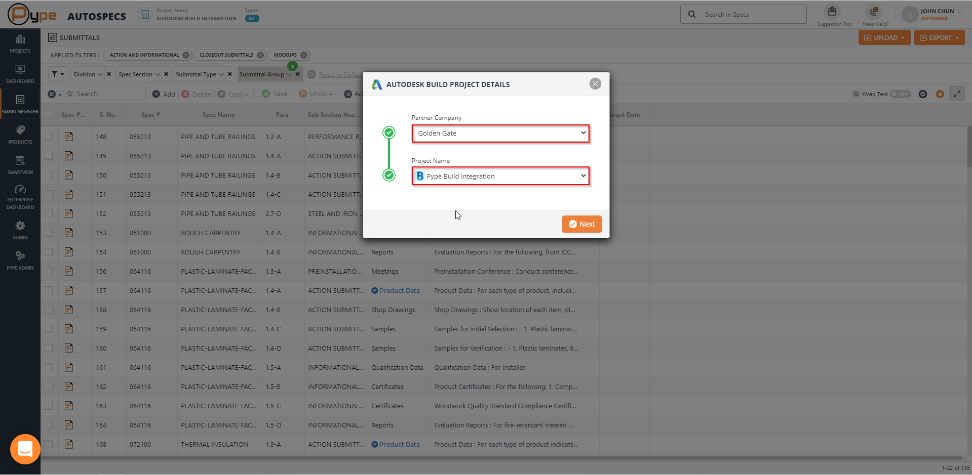 - Select your Partner Company and Project Name from the drop-down menus, then click Next. *If Partner Company and Project Name do not show up, please review your Account permissions in Autodesk Build.