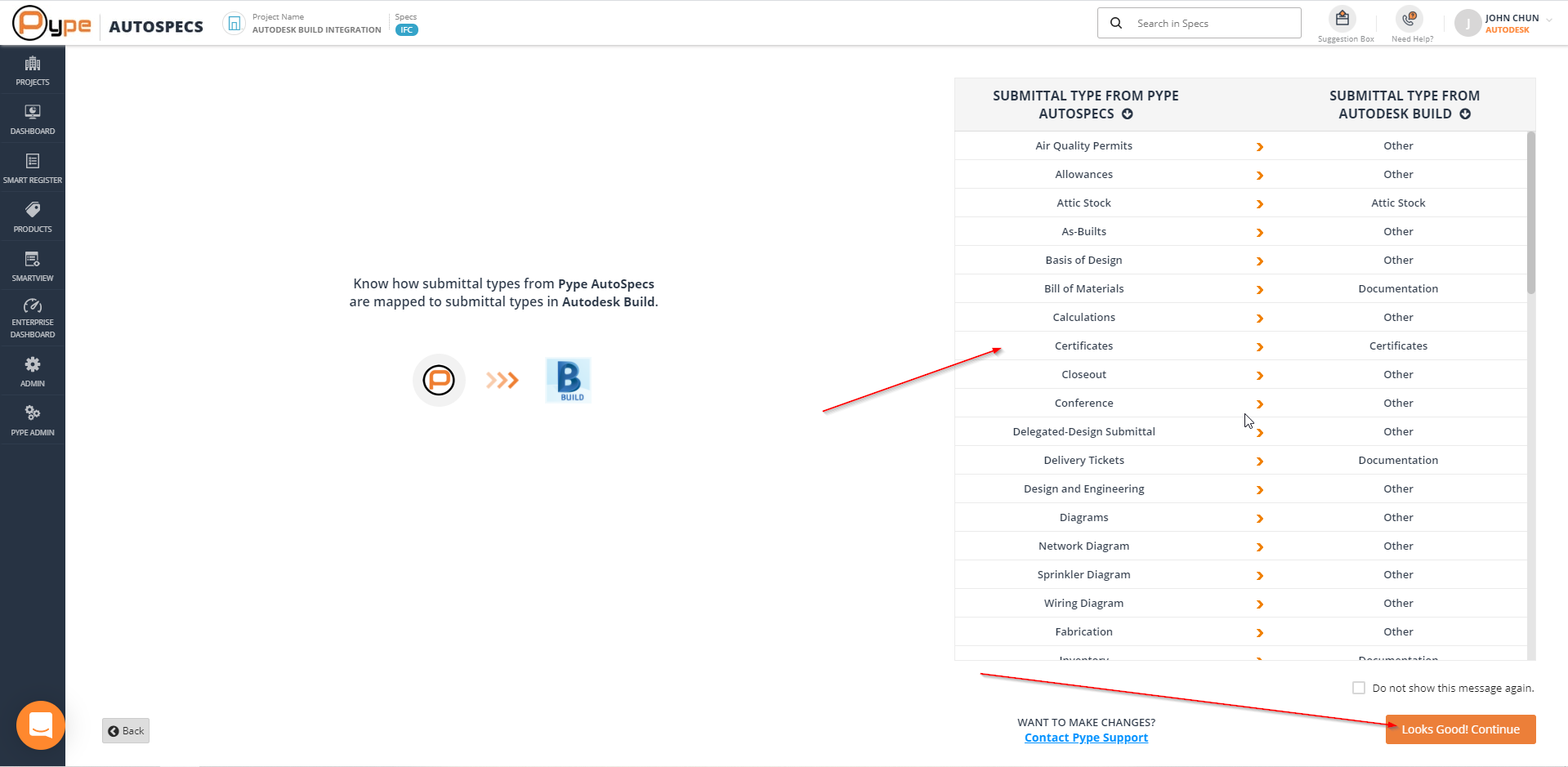 - Review the submittal type mapping to see how submittal types from Pype AutoSpecs will appear in Autodesk Build. If you are satisfied with this mapping, click Looks Good! Continue. If you would like to make changes, please contact Pype Support.