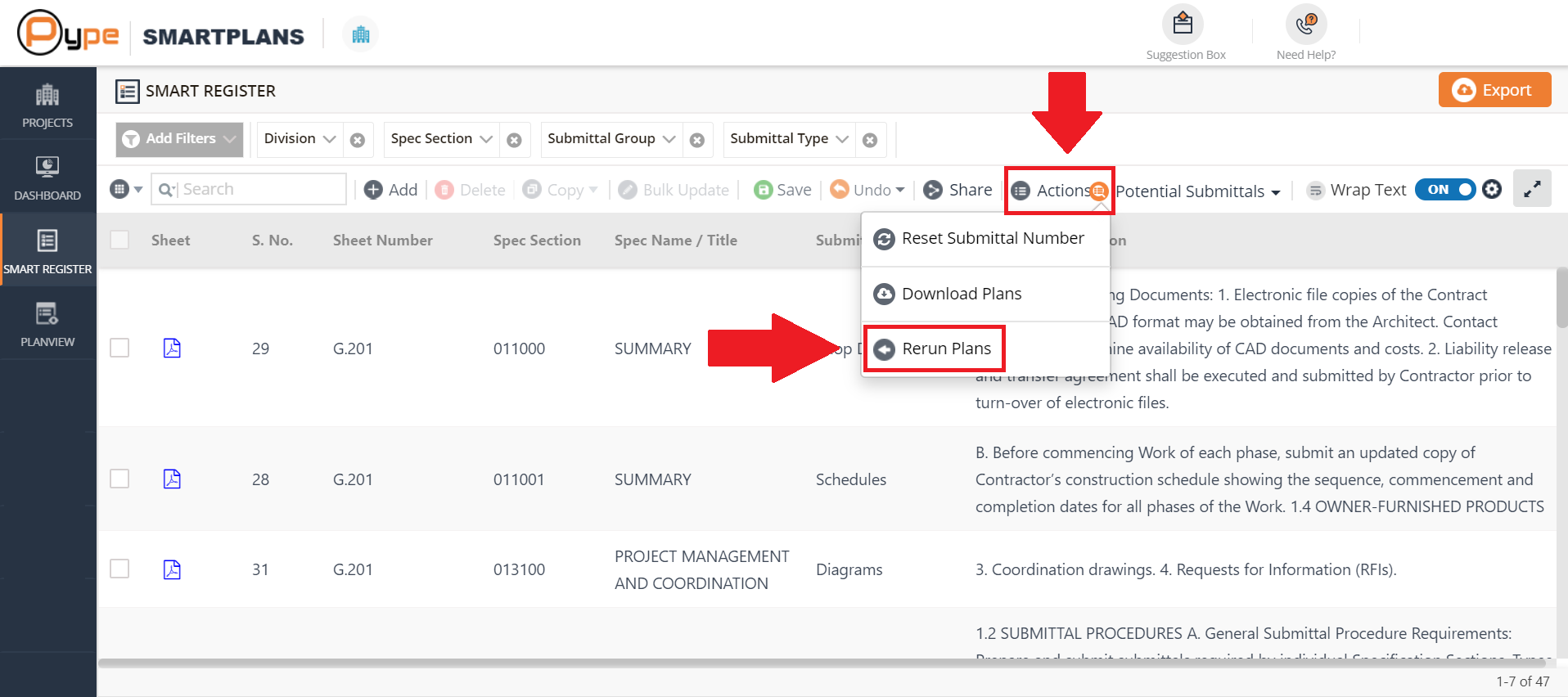 If the architect issues an updated set of drawings, you can generate a submittal log from the updated drawings using the "Rerun Plans" tool. To do this please navigate to the Smart Register and select the "Actions" button from the top ribbon. When the "Actions" menu appears, select the "Rerun Plans" button.