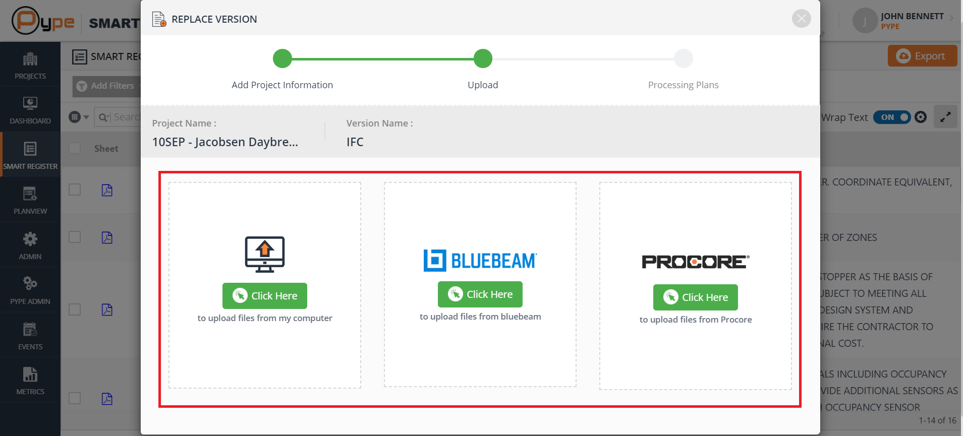 After selecting "Rerun Plans," you can then select how to upload the updated set of drawings into SmartPlans. The choices are directly from your computer, Bluebeam Studio Prime, or from Procore.