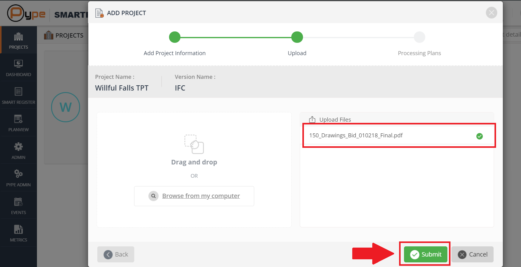 After the drawings have been uploaded, the next step is to start the submittal generation process. To do this, click on the "Submit" button and the software will start scanning the drawing documents and generating a submittal log. Depending on the size of the drawings uploaded for the project, this process can take an extended period of time. Please do not close the browser window in SmartPlans as this process is running. Once SmartPlans has completed scanning the drawings and generating a submittal log, a confirmation email will be sent to you.