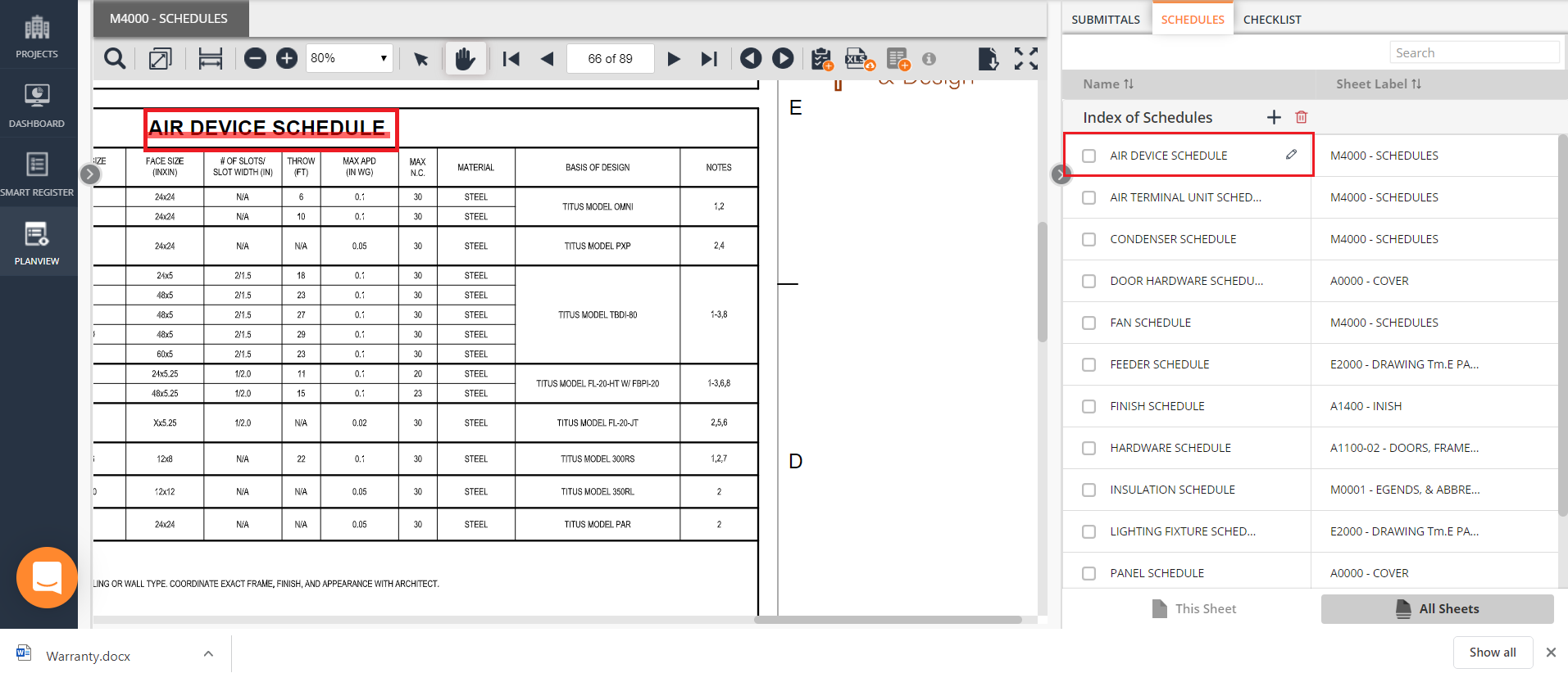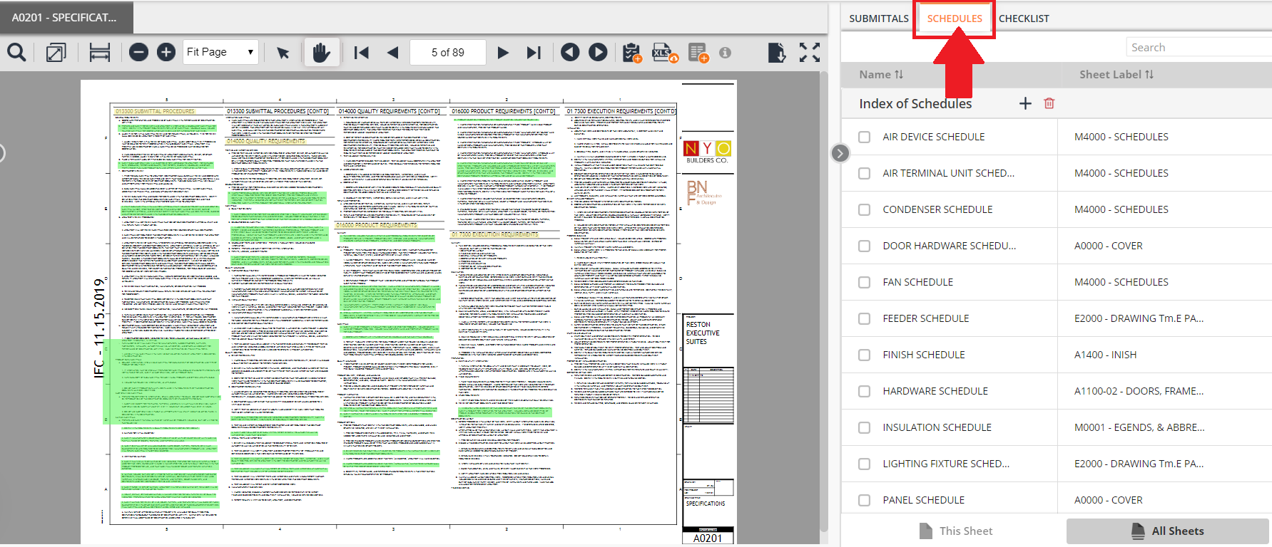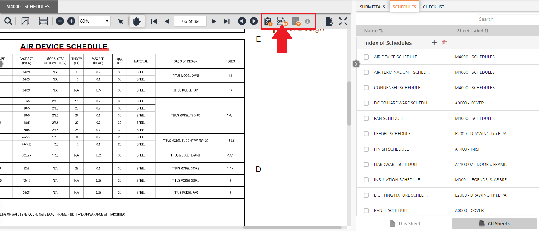 If you would like to export the schedule in Excel, add the data in the schedule to the submittal log, or add it as a note to a checklist, select the schedule that you would like to view. Once selected, the drawing sheet that contains the selected schedule will be displayed in the center screen.