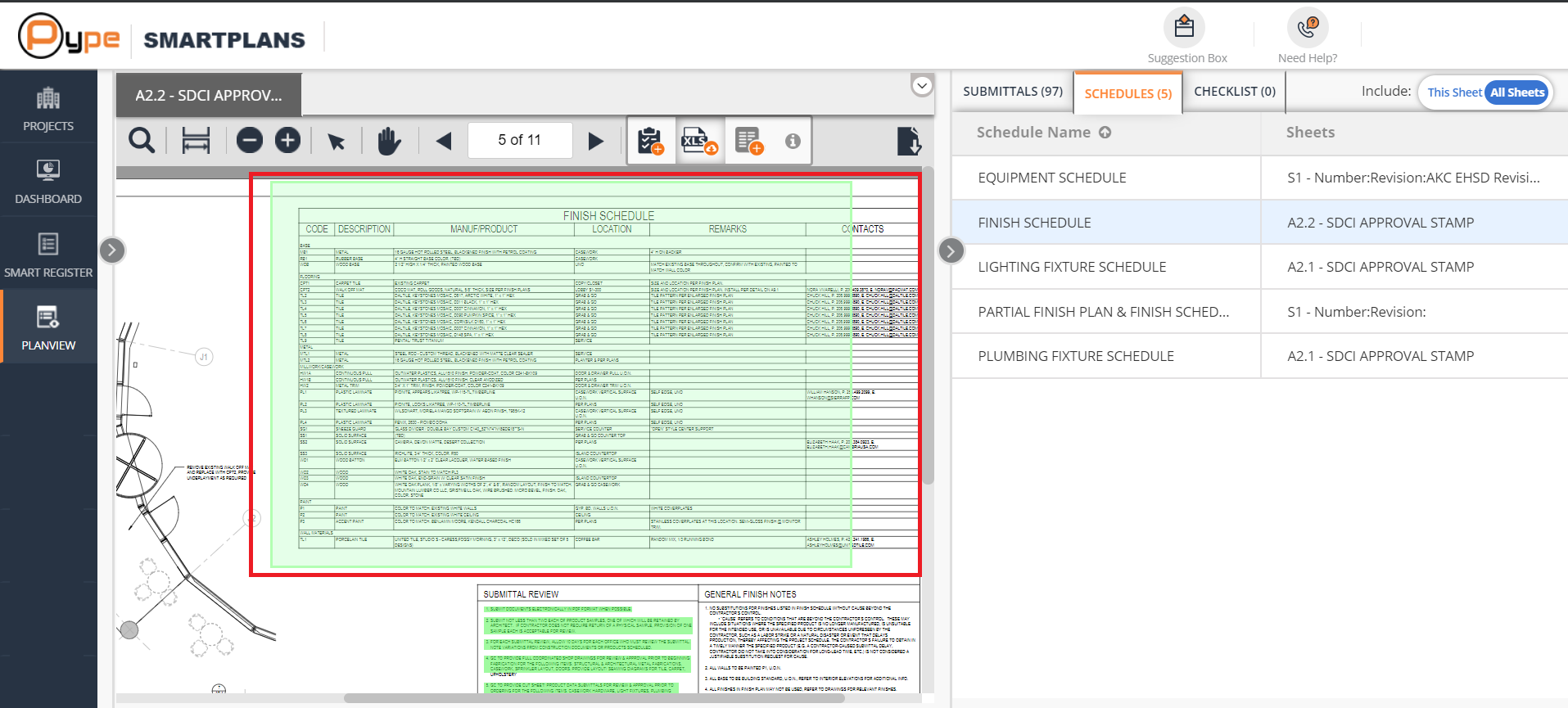 The PlanView module allows you to select schedules and text contained on a drawing sheet and either export the data or add it to the submittal register for the project. The easiest way to do this with schedules is to first select the "Schedules" tab from the menu on the right-hand side.