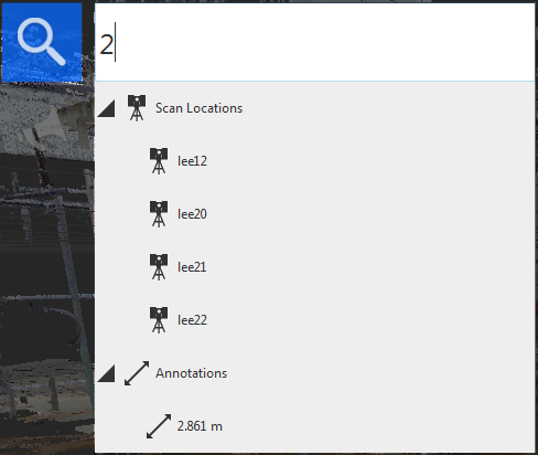 Entering a search term automatically populates the list with the best matches in real-time across all forms of searchable data within the Project. This includes Scans, View States, Regions, and Annotations.