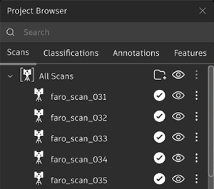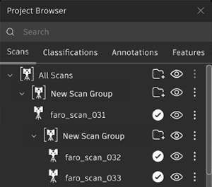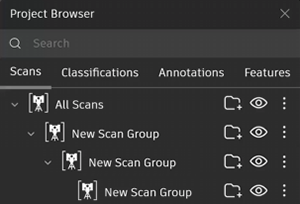 The Scan Group tool helps manage large numbers of scans by organizing them into groups. Create scan groups directly within the Project Browser. This functionality enables the categorization of scans into multi-level groups as needed. Scan Groups can be created and viewed in both Real View (including the minimap) and Point Cloud View.