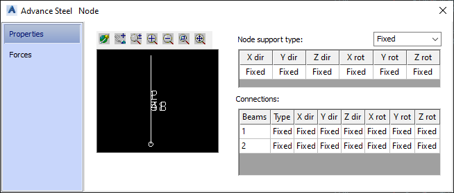 To transfer a model with structural analysis results from Robot, select the Export with calculation results option in the Integration with Autodesk Advance Steel dialog. It results in creating nodes in the transferred model in Advance Steel. These nodes contain information about supports, releases, and internal forces from Robot. In Advance Steel, use values of internal forces to perform code checking of connections.