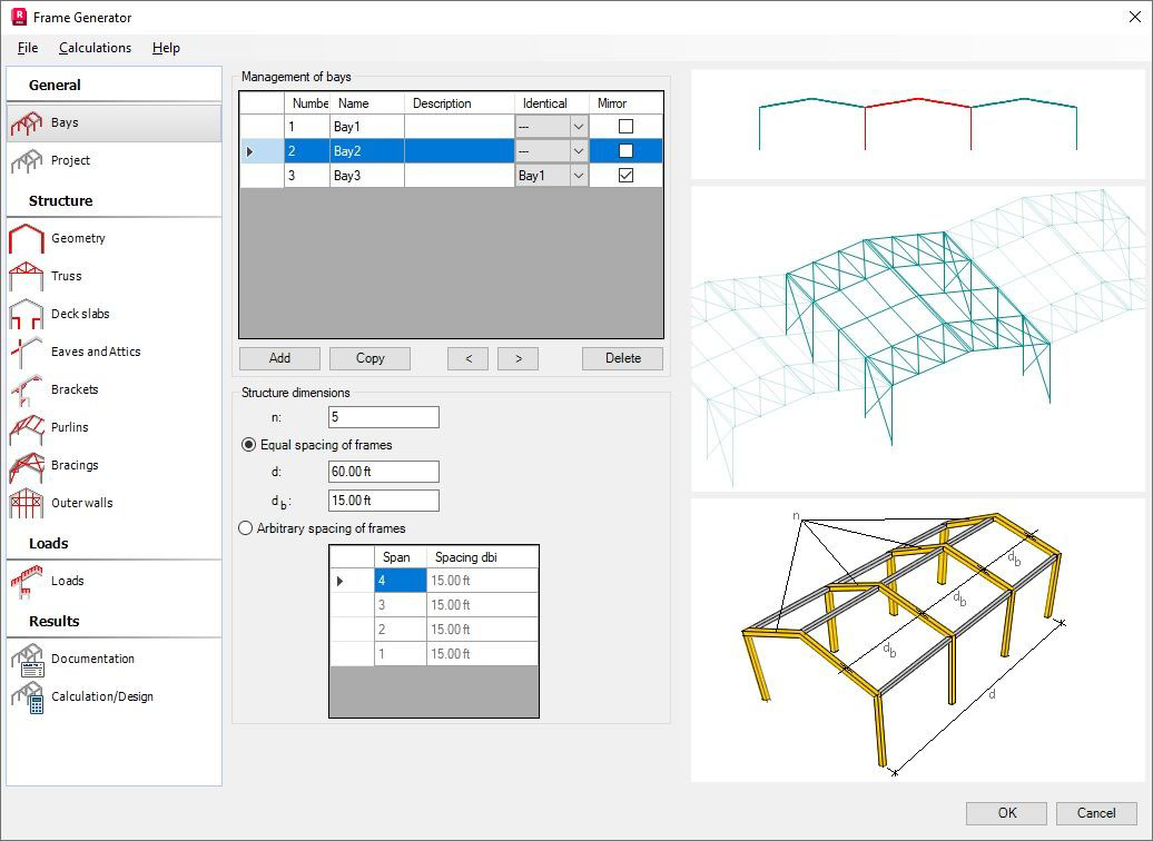 In order to change parameters of the bay for which the option Identical to is activated, use the Edit bay parameters link located on every tab with the copied bay in Geometry (the bay will remain identical to the original one) or delete the Identical to option from a given bay (the bay will become independent of the original bay).