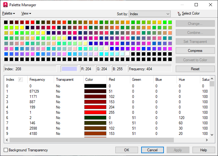 - The list view provides numeric data for each entry in the palette, such as RGB color values, frequency, and background transparency.