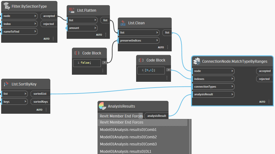 The Dynamo node takes as input a connection node or a list of connection nodes, the index or indexes of the structural elements that will be connected, the list of connection types and a source of data for structural analysis results.