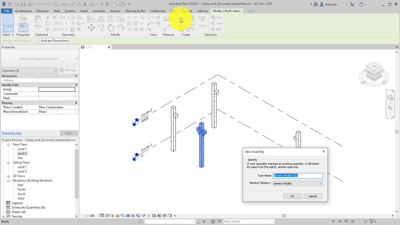 For example, your model may require multiple instances of a structural column with a corbel on each of two opposite sides. To create an assembly from these three elements, select them and then click the Create Assembly tool. If no matching assemblies exist in the project, the New Assembly dialog displays an editable Type Name, which is automatically assigned based on the currently selected Naming Category. When more than one element of a category is included in an assembly, you can select a different one to use as a Naming Category. In this case, you could select the Generic Models category to which the corbels belong. To accept the default category of columns, click OK. Notice that the assembly type Columns 01 is added to the Project Browser under Assemblies.