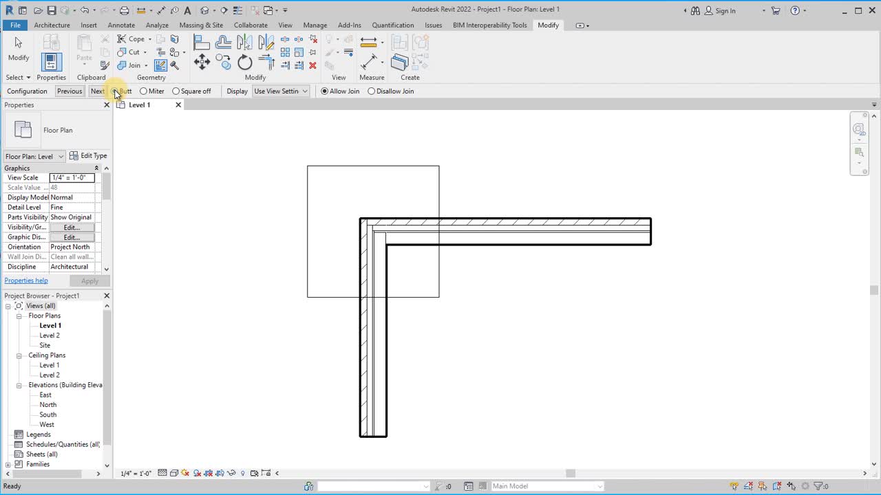 When walls meet at a 90-degree corner, there are only a few possibilities. Click Modify > Wall Joins to edit the join condition. When you position your cursor near an intersection of walls or a wall end a square target is displayed, click to select the intersection you want to edit.