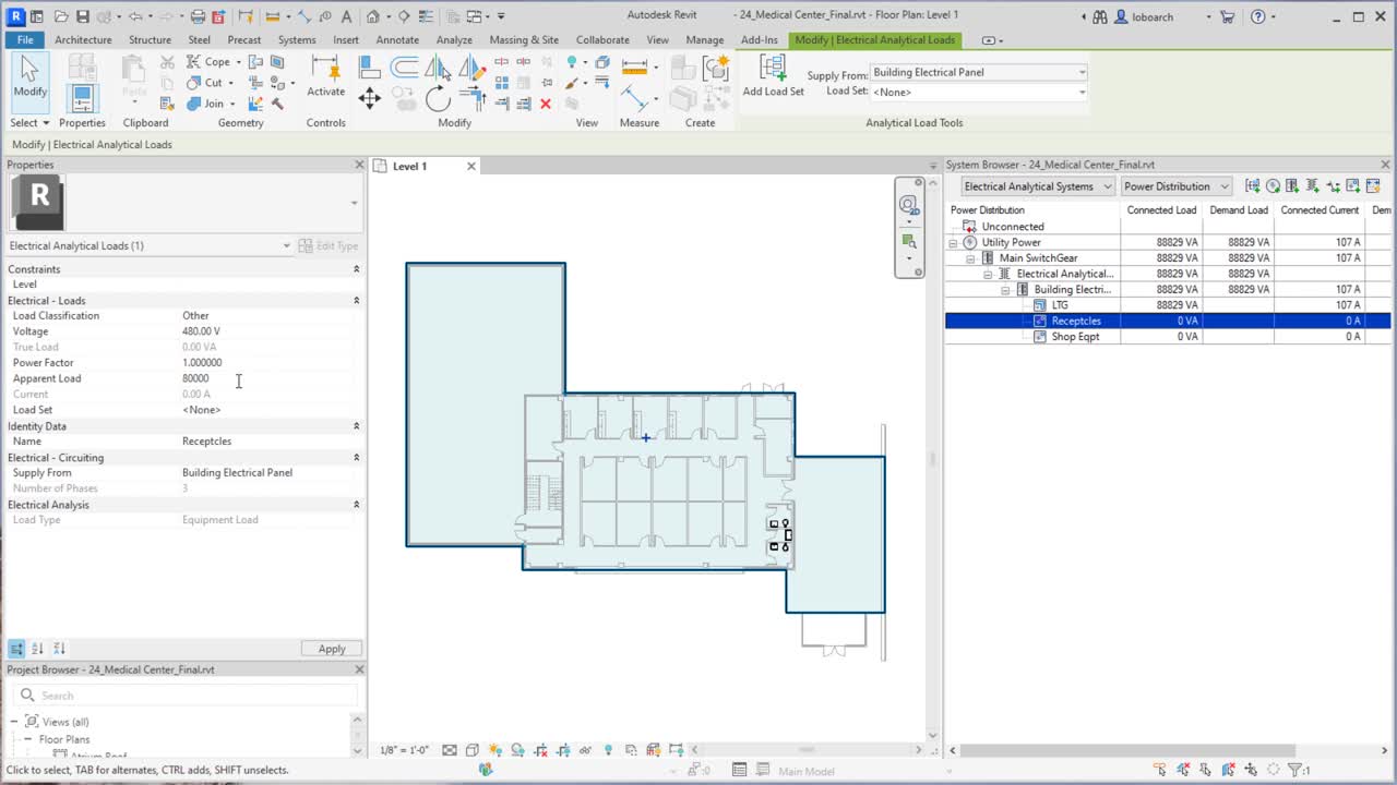 You can further describe these electrical elements from the System Browser. Select an element such as an Equipment Load. Then in the Properties palette, specify the Load Classification, Voltage, Power Factor, or Apparent Load. For instance, to define the Apparent Load, under Electrical - Loads, select the Apparent Load text field and enter a value, such as, "80,000". Continue modifying your electrical elements as needed. Notice that, as you define the elements, the System Browser updates accordingly, which keeps all your analytical electrical system elements directly within the Revit environment. This makes it much easier to determine preliminary building load and load on main equipment components directly within the model.