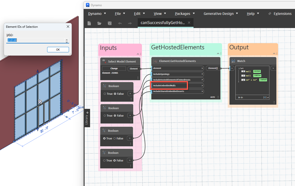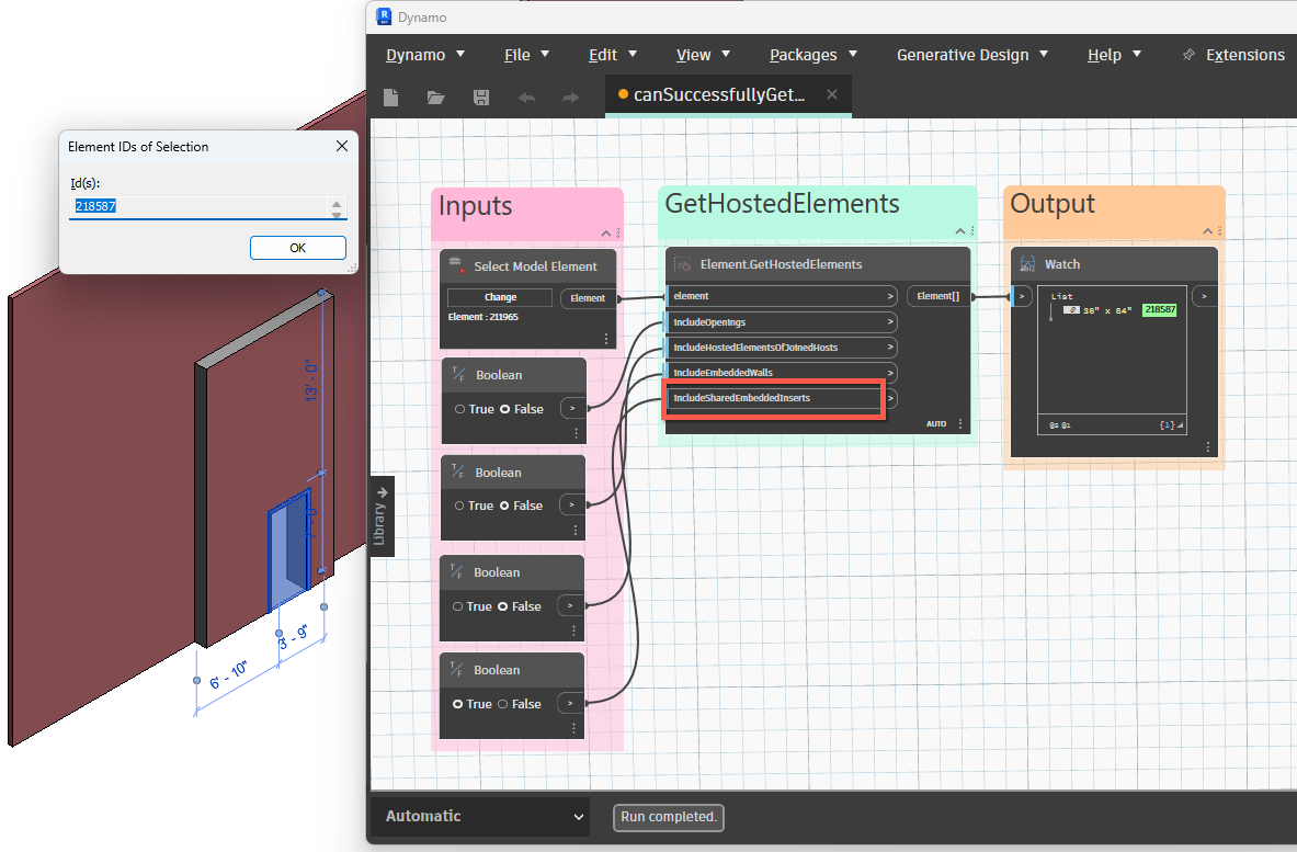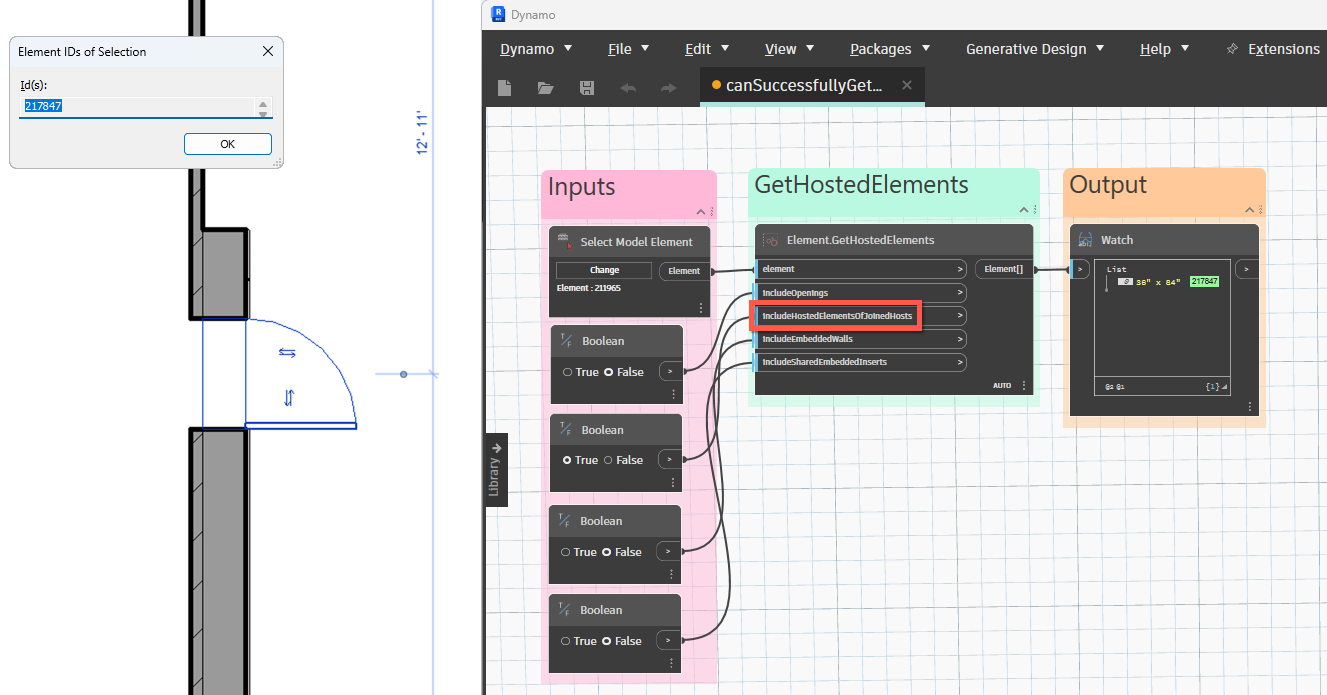 Use this node when two walls are joined (by Modify->Geometry->Join), and a door is placed on one of the joined walls. If includeShadow is set to true, then Revit returns the door element ID. |