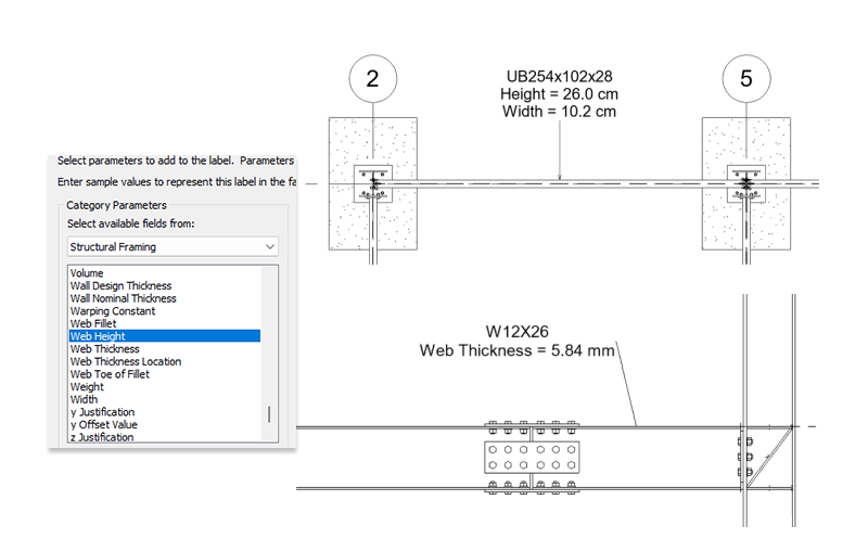 Use structural section shape parameters to customize your tag labels for structural framing.