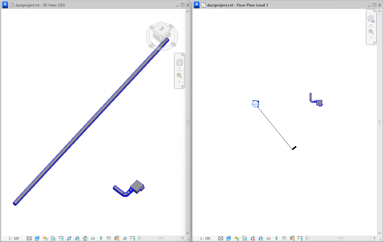 Although both ends of the existing duct fall within the view range in the following example, only one is available. The other connector is already in use. The available connector is used, even though it is furthest from the view plane.