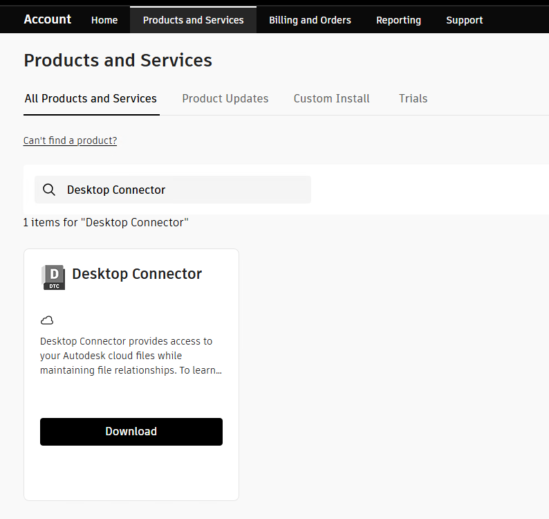 To download the latest version, go to Autodesk Account Products and Services. Desktop Connector appears under Products and Services.