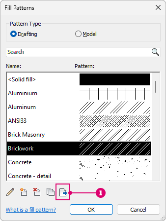 In the Fill Patterns dialog, accessed from the Manage tab, select a pattern or multiple patterns to export to a PAT file