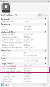 In addition to the report which is generated after an analysis, the heating, cooling, and air flow peak demands are also set as properties on each analytical space. The following example shows the same cooling load as highlighted in the report section above.