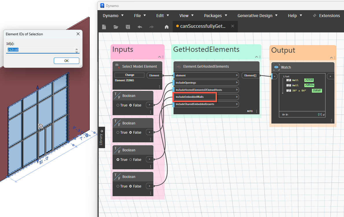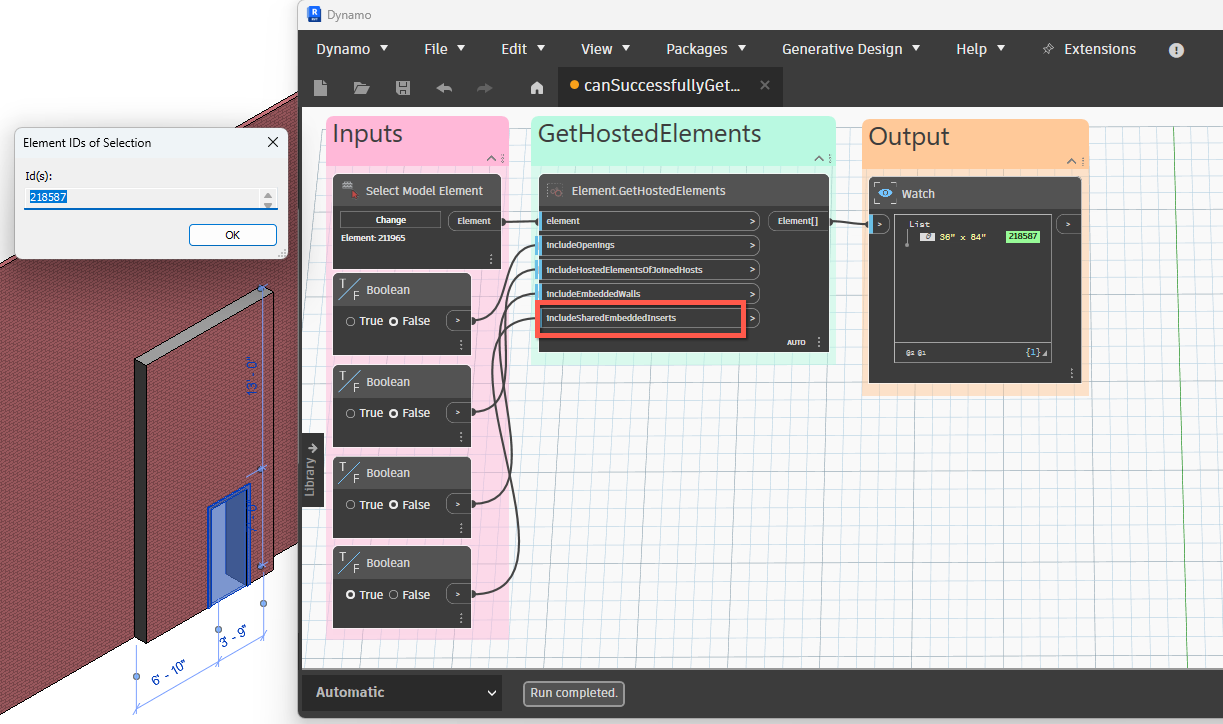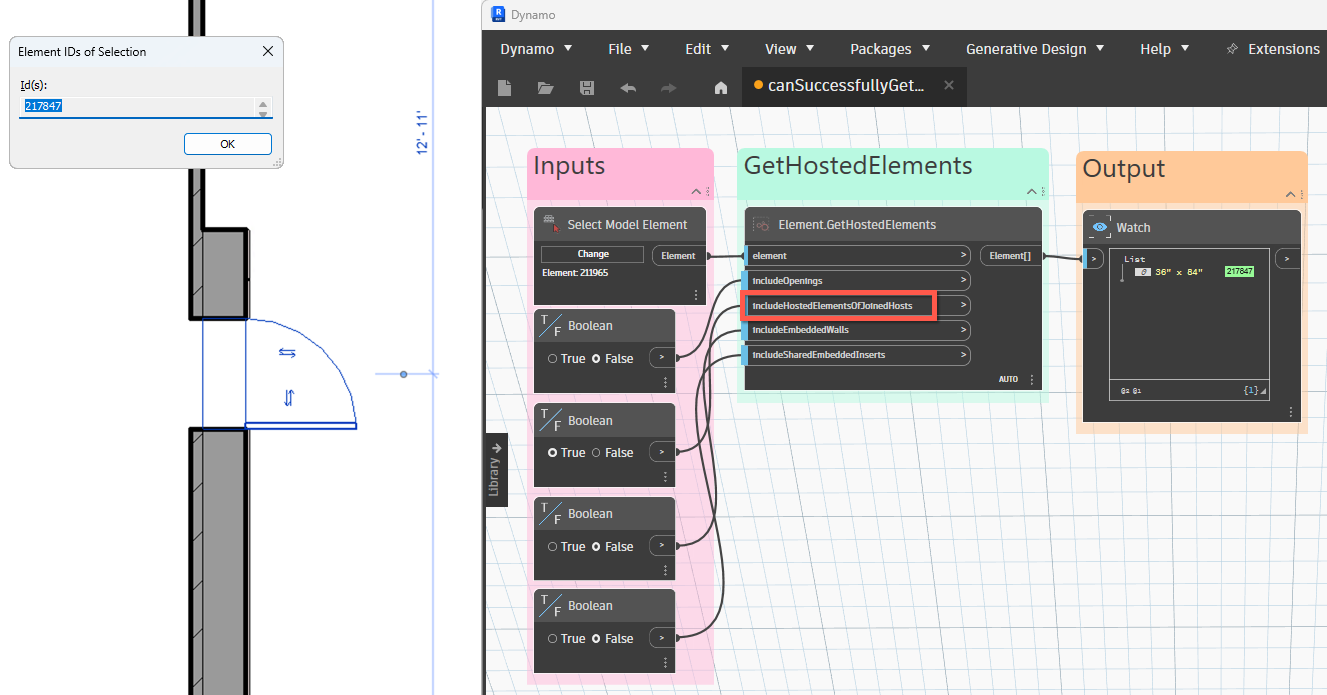 Use this node when two walls are joined (by Modify->Geometry->Join), and a door is placed on one of the joined walls. If includeShadow is set to true, then Revit returns the door element ID. |