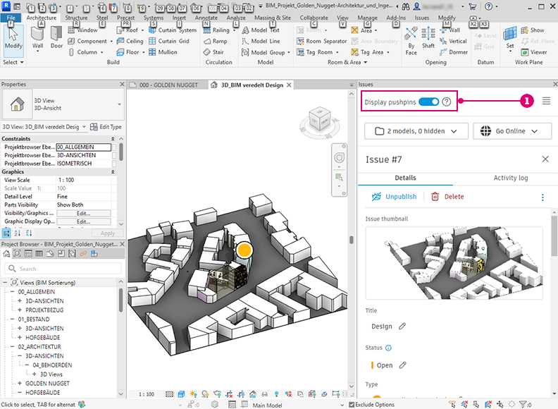 When working with Revit Issues add-in, select Display pushpins