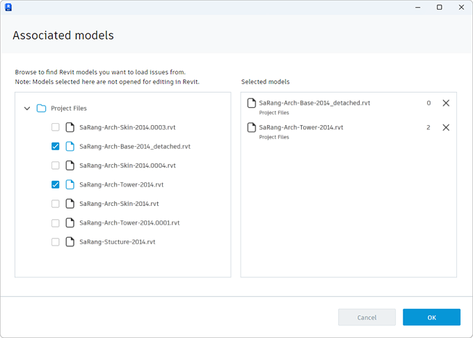Note: Desktop Connector must be installed and active in order to load associated models. - Expand the folder structure to find the Revit (.rvt) files that you want to associate with the currently open file.