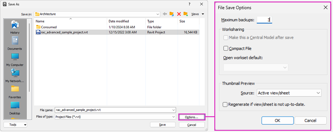 By default, Revit saves up to 3 backup files for each project. You can change the number of backup files that Revit saves for a project.