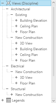 The following image shows views in the Project Browser organized by discipline, then by phase, and then by view type.
