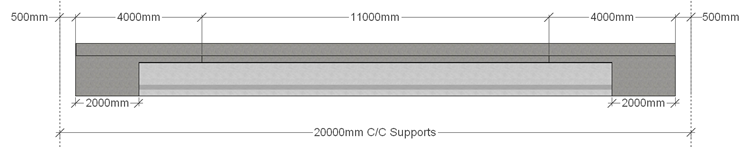The precast beam is 19m long but, when the insitu diaphragm is cast, the composite beam spans 20m between the centre lines of the integral supports. It is constructed using grade C50/60 concrete and prestressed with standard wire strands, each having an effective area of 150mm2 and a nominal radius of 16mm. The characteristic strength of each tendon is 1861MPa and they are set to have a relaxation of 2.5% at 1000 hours.