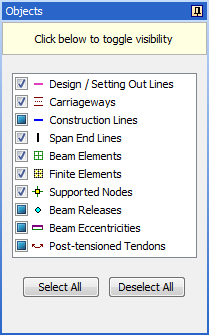 By default all object types are visible. They may all be hidden by clicking on the Deselect All button and they may all be made visible again by clicking on the Select All button.