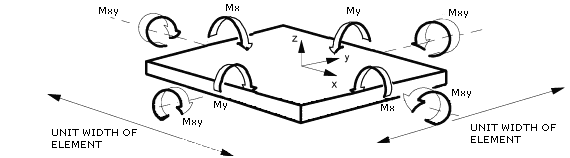 The bending moments and shear forces within an element are caused by the out-of-plane deformation of the element alone. The bending moments per unit width can be expressed as a moment triad Mx, My, Mxy.