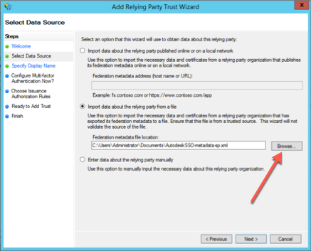 .Click Browse and select the file "AutodeskSSO-metadata.xml". Click Next.