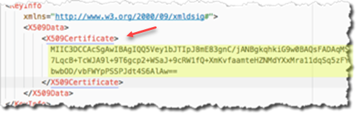 Copy the content enclosed by the X509Certificate tags under KeyDescriptor use="signing." There are two X509 certificate tags listed; usually the first tag is the signing certificate. Make sure that you select the correct tag content. You can either copy the text value or save it to a *.cer file to upload in Autodesk Account. (This is "Identity provider certificate" in Autodesk Account.)