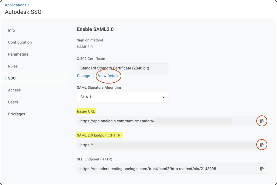 In the OneLogin portal, go to Applications > Autodesk SSO > SSO.