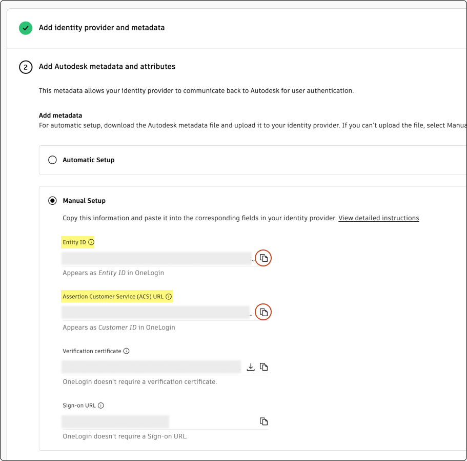 In Autodesk, copy the Entity ID and Assertion Customer Service (ACS) URL. OneLogin does not require the verification certificate so you can ignore this field.