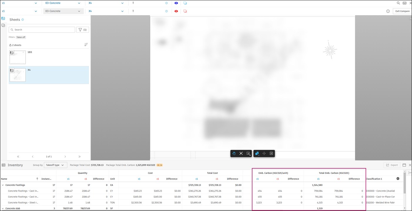 As part of Takeoff's BETA carbon accounting features, carbon values are available for comparison in the Inventory when comparing a Takeoff snapshot of a sheet with your Work in Progress. Learn more about carbon accounting in Takeoff (BETA).