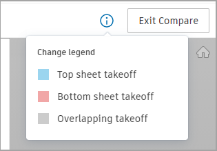 View a change legend when work in progress takeoff is compared with a snapshot, or when the takeoff from two snapshots is compared. To view the change legend, click the ‘i’ information icon by the Exit Compare button at the right of the screen.