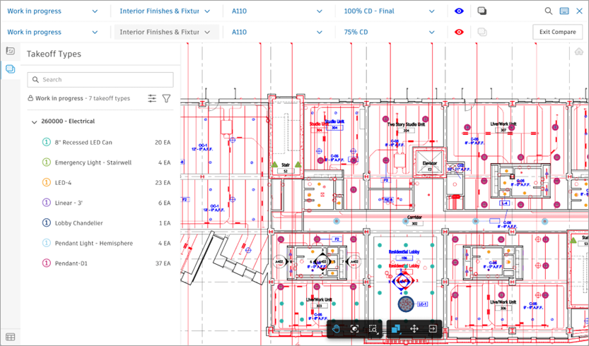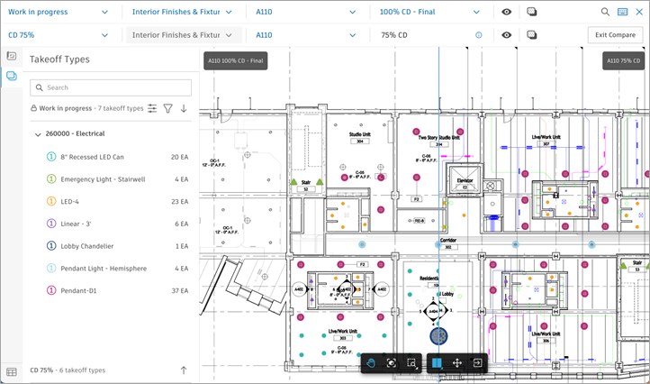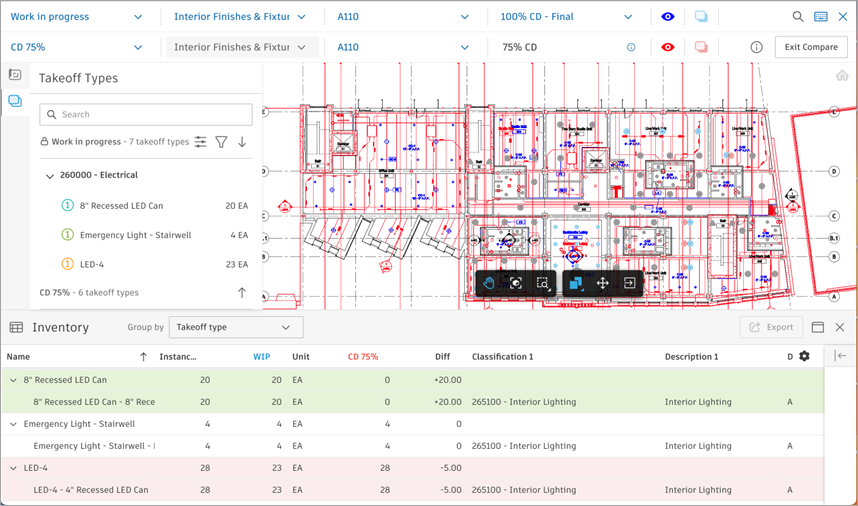 Visually compare sheets with takeoff and their quantities from your work in progress and snapshots within the same takeoff package. You can view either a side by side or overlay comparison in the Takeoff viewer. You can also see comparison data for quantities in the inventory for the sheets being compared.