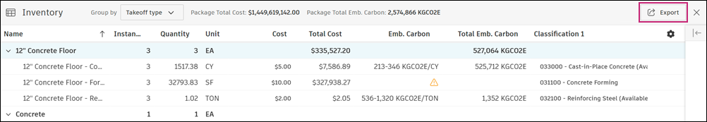 Export Takeoff with Carbon Data from Inventory (BETA)
