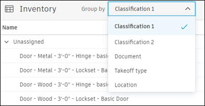 You can change the view of your inventory by grouping items in the table by Classification 1, Classification 2, Document, Takeoff Type, or Location.
