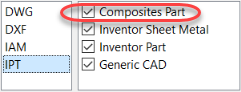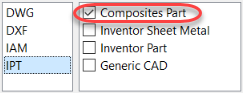 If you know you will often be using the same file type—for example, once again, composites files—you could select "Composites Part," deselect all other choices, and then save this file as an Inventor Nesting template with a meaningful name such as justcomposites.inest. ( .)