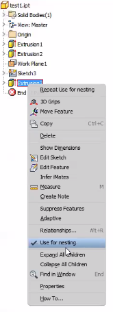 After applying Use For Nesting, make sure to save the IPT after setting this value. When you add the model to Inventor Nesting, the sketch or extrusion you specified will be used for the nest. You can still change which sketch or extrusion is used after bringing in the model. See To Adjust Sketch and Extrusion Properties.