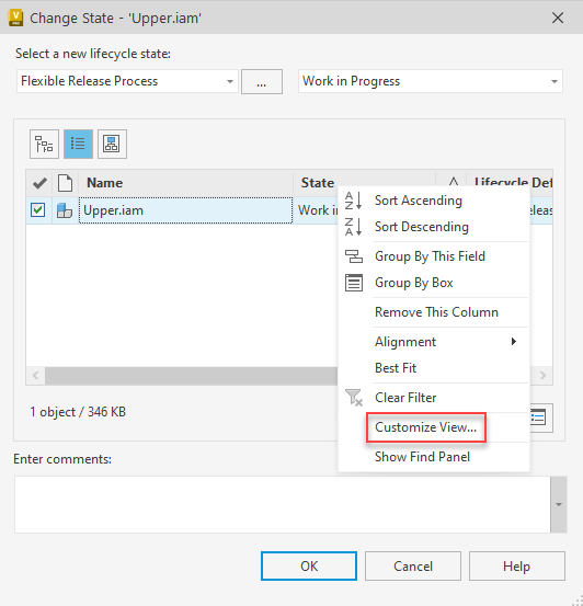 Customize view functionality is added to adjust the view of the columns in several dialogs (Change State, Change Revision, Change Category, Pack and Go, Synchronize Properties, Undo Check Out). By making efficient use of properties and customizing your view, data management becomes much more tailored to your project.