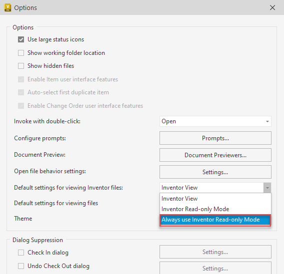 A new option called "Always use Inventor Read-only mode" is added to Vault Options for viewing the Inventor files setting. This option is always available regardless of whether the DWF file is available or not.