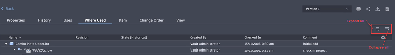 Expand or collapse rows in a tree view. This functionality is available in the File (Uses and Where Used tabs) and Items (Where Used and BOM) details page.