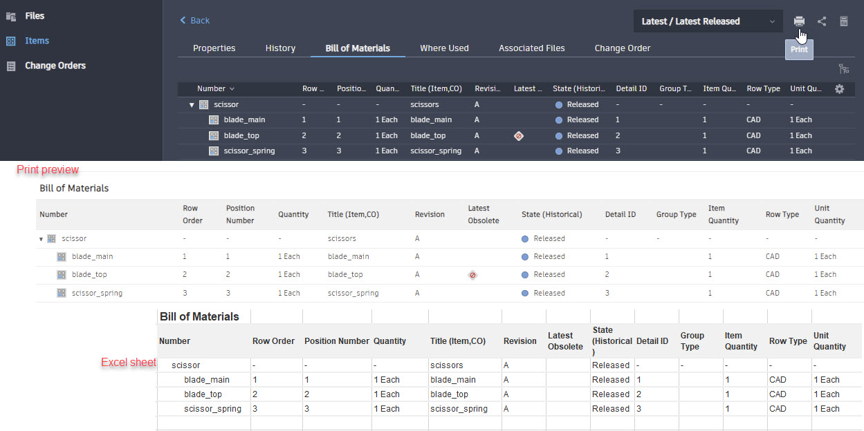 Select the rows to copy the data to the Excel spreadsheet. If you are copying items, select BOM levels to include BOM levels in the print preview.